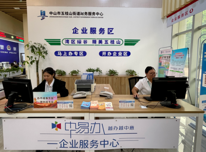 五桂山街道政务服务中心整合21个服务窗口、800项业务,推出“一照通行”“一窗通取”服务——企业开办所需的营业执照、公章刻制、社保登记、税务备案等全流程,在一个窗口提交材料,数据实时同步至相关部门,最快1个工作日就能领齐所有实体证件。“中易办”企业服务中心更成为企业“专属顾问”,从政策咨询到材料指导,全程跟进,让企业起步少绕弯路。